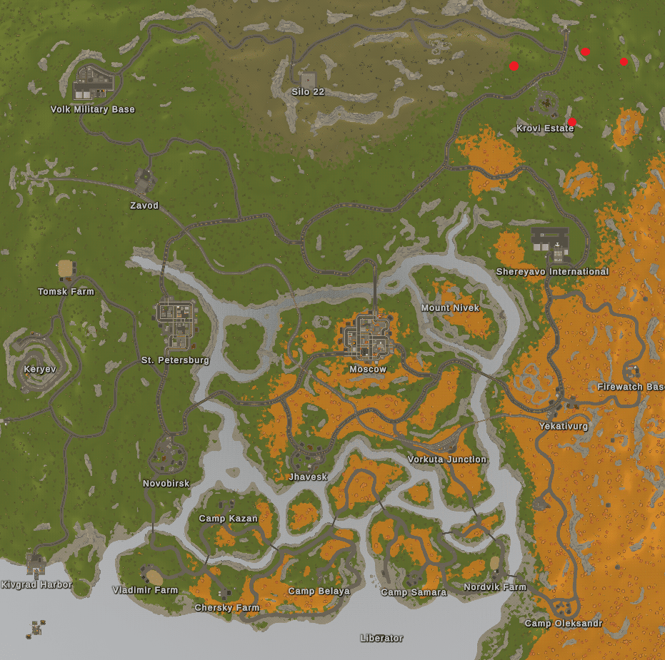 Keryev Quarry is for those of you who like to build big. Boasting numerous metal rock nodes, one can quickly harvest loads of metal to build a large fortress quickly. Pick an overlooking hill and make an impenetrable metal compound to call home. Keryev contains a small mechanic and a gas tank to maintain and fuel a vehicle in addition to its numerous construction spawns. St. Petersburg is just over a hill to the East for the odds and ends you might need. For high-tier gear, you can make short trips north to the collapsed train tunnel or Zavod. You are likewise within a reasonable distance of Volk Military Base and Silo 22, especially with a vehicle.